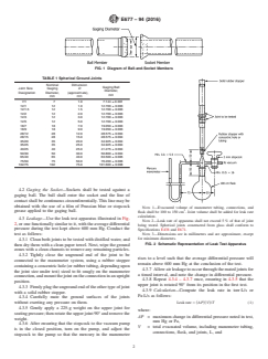 ABSTRACT This specification covers standard dimensional requirements for obtaining interchangeable spherical ground joints. This specification does not include physical, chemical, and design characteristics of material used. Dimensional requirements include socket member design, ball member design, size designation, dimensions, and interchangeability. Ground joints shall be tested for ball and socket dimensions and leakage. Leak rate shall be calculated based on change in differential pressure, evacuated volume and time of test. SCOPE 1.1 This specification covers standard dimensional requirements for obtaining, within practical limits, interchangeability in spherical ground joints for ordinary laboratory and industrial applications. It covers dimensional interchangeability of the ground surfaces only and does not involve design characteristics of the item except where specified, nor does it involve physical or chemical characteristics of the material used. Note 1: The dimensions pertaining to spherical ground joints were taken from the Commercial Standard CS 21–58 of the U.S. Department of Commerce. Note 2: Although glass is the most commonly used material for ground joints, other materials may be used as specified. Spherical joints constructed from glass shall conform to Specifications E438 and E671. 1.2 The following precautionary caveat pertains only to the Test Method portion, Section 4, of this specification. This standard does not purport to address all of the safety concerns, if any, associated with its use. It is the responsibility of the user of this standard to establish appropriate safety and health practices and determine the applicability of regulatory limitations prior to use.