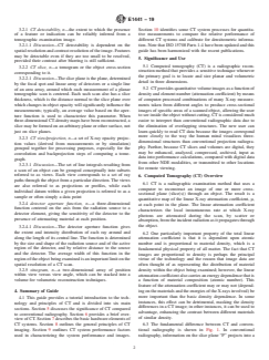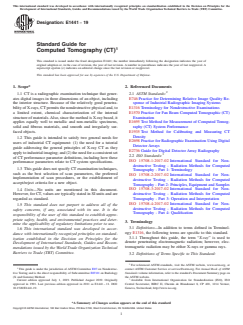 SIGNIFICANCE AND USE 5.1 Computed tomography (CT) is a radiographic reconstruction method that provides a sensitive technique whenever the primary goal is to locate and size planar and volumetric detail in three dimensions. 5.2 CT provides quantitative volume images as a function of density and element number (attenuation coefficient) by means of computer-processed combinations of many X-ray measurements taken from different angles to produce cross-sectional images of specific areas of a scanned object, allowing the user to see inside the object without cutting. CT is considered much easier to interpret than conventional radiographic data due to the elimination of overlapping structures. The new user can learn quickly to read CT data because the images correspond more closely to the way the human mind visualizes three-dimensional structures than conventional projection radiography. Further, because CT slices and volumes are digital, they may be enhanced, analyzed, compressed, archived, input as data into performance calculations, compared with digital data from other NDE modalities, or transmitted to other locations for remote viewing. SCOPE 1.1 CT is a radiographic examination technique that generates digital images in three dimensions of an object, including the interior structure. Because of the relatively good penetrability of X-rays, CT permits the nondestructive physical and, to a limited extent, chemical characterization of the internal structure of materials. Also, since the method is X-ray based, it applies equally well to metallic and non-metallic specimens, solid and fibrous materials, and smooth and irregularly surfaced objects. 1.2 This guide is intended to satisfy two general needs for users of industrial CT equipment: (1) the need for a tutorial guide addressing the general principles of X-ray CT as they apply to industrial imaging; and (2) the need for a consistent set of CT performance parameter definitions, including how these performance parameters relate to CT system specifications. 1.3 This guide does not specify CT examination techniques, such as the best selection of scan parameters, the preferred implementation of scan procedures, or the establishment of accept/reject criteria for a new object. 1.4 Units—No units are mentioned in this document. However, for CT, values are typically stated in SI units and are regarded as standard. 1.5 This standard does not purport to address all of the safety concerns, if any, associated with its use. It is the responsibility of the user of this standard to establish appropriate safety, health, and environmental practices and determine the applicability of regulatory limitations prior to use. 1.6 This international standard was developed in accordance with internationally recognized principles on standardization established in the Decision on Principles for the Development of International Standards, Guides and Recommendations issued by the World Trade Organization Technical Barriers to Trade (TBT) Committee.
