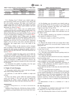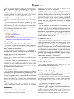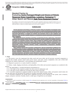 SIGNIFICANCE AND USE 5.1 Introduction of robots to the responder's cache for use in urban search and rescue missions may have an impact on the logistical planning for the response teams. Additional volume and weight shall be stored and transported to the response site. Additional preparation time shall be allotted to ready the robot for deployment. The tools that are taken to the field may need to be augmented to service the robots. Once the robot is ready for deployment, it shall be transported from the base of operations to the mission zone. Responders may have to carry the robot and its controller or may have to provide some other transportation mechanism if it is too heavy. 5.2 This practice is designed to appraise the impact in terms of logistical considerations for a response organization. SCOPE 1.1 This practice covers the requirement that urban search and rescue robots and all necessary associated components or equipment (for example, operator control station, power sources, spare parts, sensors, manipulators, tools, and so forth) shall complement the response organization’s cache packaging and transportation systems. 1.2 Shipment by ground, air, or marine should be considered. 1.3 Volume, weight, shipping classification, and deployability of the robots and associated components are considered in this practice. 1.3.1 The deployability is considered through the determination of: 1.3.1.1 The length of time required to prepare the robot system for deployment, and 1.3.1.2 The types of tools required for servicing the robot system in the field. 1.3.2 Associated components or equipment include not only all the onboard sensors, tethers, and operator control station, but also any spare parts and specialized tools needed for assembly, disassembly, and field servicing. 1.3.3 Associated components also include power equipment necessary for the operation of the system, such as batteries, chargers, and power converters. Gasoline, diesel, or other types of liquid fuel are not included. 1.4 The packaged items shall support the operational availability of the robot during a deployment of up to ten days. There shall be no resupply within the first 72 h of deployment. 1.5 No such standards currently exist except for those relevant to shipping (for example, CFR Title 49 and International Air Transport Association (IATA) documents). 1.6 The values stated in SI units are to be regarded as the standard. The values given in parentheses are for information only. 1.7 This standard does not purport to address all of the safety concerns, if any, associated with its use. It is the responsibility of the user of this standard to establish appropriate safety and health practices and determine the applicability of regulatory limitations prior to use.