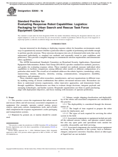ASTM E2592-16 is a standard published by ASTM International. Its full title is "Standard Practice for Evaluating Response Robot Capabilities: Logistics: Packaging for Urban Search and Rescue Task Force Equipment Caches". This standard covers: SIGNIFICANCE AND USE 5.1 Introduction of robots to the responder's cache for use in urban search and rescue missions may have an impact on the logistical planning for the response teams. Additional volume and weight shall be stored and transported to the response site. Additional preparation time shall be allotted to ready the robot for deployment. The tools that are taken to the field may need to be augmented to service the robots. Once the robot is ready for deployment, it shall be transported from the base of operations to the mission zone. Responders may have to carry the robot and its controller or may have to provide some other transportation mechanism if it is too heavy. 5.2 This practice is designed to appraise the impact in terms of logistical considerations for a response organization. SCOPE 1.1 This practice covers the requirement that urban search and rescue robots and all necessary associated components or equipment (for example, operator control station, power sources, spare parts, sensors, manipulators, tools, and so forth) shall complement the response organization’s cache packaging and transportation systems. 1.2 Shipment by ground, air, or marine should be considered. 1.3 Volume, weight, shipping classification, and deployability of the robots and associated components are considered in this practice. 1.3.1 The deployability is considered through the determination of: 1.3.1.1 The length of time required to prepare the robot system for deployment, and 1.3.1.2 The types of tools required for servicing the robot system in the field. 1.3.2 Associated components or equipment include not only all the onboard sensors, tethers, and operator control station, but also any spare parts and specialized tools needed for assembly, disassembly, and field servicing. 1.3.3 Associated components also include power equipment necessary for the operation of the system, such as batteries, chargers, and power converters. Gasoline, diesel, or other types of liquid fuel are not included. 1.4 The packaged items shall support the operational availability of the robot during a deployment of up to ten days. There shall be no resupply within the first 72 h of deployment. 1.5 No such standards currently exist except for those relevant to shipping (for example, CFR Title 49 and International Air Transport Association (IATA) documents). 1.6 The values stated in SI units are to be regarded as the standard. The values given in parentheses are for information only. 1.7 This standard does not purport to address all of the safety concerns, if any, associated with its use. It is the responsibility of the user of this standard to establish appropriate safety and health practices and determine the applicability of regulatory limitations prior to use.