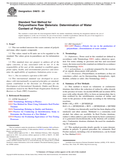ASTM D4672-24: Standard Test Method for Polyurethane Raw Materials – Determination of Water Content of Polyols provides standard procedures for measuring water content in polyols and other organic compounds. This test method is essential in the polyurethane industry, where accurate moisture content determination is critical, as water in polyols can significantly affect reactions with isocyanates and ultimately the quality of polyurethane products. This document aligns with international standardization principles and is equivalent to ISO 14897.