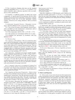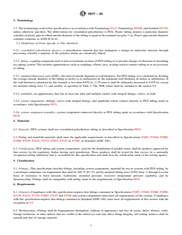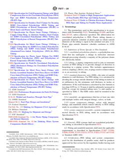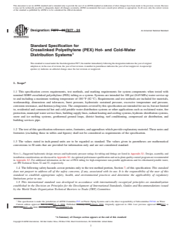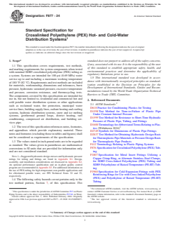 ABSTRACT This specification covers requirements, test methods, and methods of marking for crosslinked polyethylene plastic hot- and cold-water distribution systems components made in one standard dimension ratio. Components are comprised of tubing and fittings intended for use in residential and commercial, hot and cold, potable water distribution systems as well as sealed central heating, including under-floor heating systems. Requirements and test methods are included for materials, workmanship, dimensions and tolerances, burst pressure, sustained pressure, excessive temperature and pressure, temperature cycling tests, and bend strength. Also included are tests related to system malfunctions. SCOPE 1.1 This specification covers requirements, test methods, and marking requirements for system components when tested with nominal SDR9 crosslinked polyethylene (PEX) tubing as a system. Systems are intended for 100 psi (0.69 MPa) water service up to and including a maximum working temperature of 180 °F (82 °C). Requirements and test methods are included for materials, workmanship, dimensions and tolerances, burst pressure, hydrostatic sustained pressure, excessive temperature and pressure, corrosion resistance, and thermocycling tests. The components covered by this specification are intended for use in, but not limited to, residential and commercial hot and cold potable water distribution systems or other applications such as reclaimed water, fire protection, municipal water service lines, building supply lines, radiant heating and cooling systems, hydronic distribution systems, snow and ice melting systems, geothermal ground loops, district heating, turf conditioning, compressed air distribution, and building services pipe. 1.2 The text of this specification references notes, footnotes, and appendixes which provide explanatory material. These notes and footnotes (excluding those in tables and figures) shall not be considered as requirements of the specification. 1.3 The values stated in inch-pound units are to be regarded as standard. The values given in parentheses are mathematical conversions to SI units that are provided for information only and are not considered standard. Note 1: Suggested hydrostatic design stresses and hydrostatic pressure ratings for tubing and fittings are listed in Appendix X1. Design, assembly, and installation considerations are discussed in Appendix X2. An optional performance qualification and an in-plant quality control program are recommended in Appendix X3. For additional information on the use of PEX tubing for high-temperature non-potable applications and for chlorinated potable water, see PPI Technical Notes 52 and 53, respectively. 1.4 The following safety hazards caveat pertains only to the test method portion, Section 7, of this specification: This standard does not purport to address all of the safety concerns, if any, associated with its use. It is the responsibility of the user of this standard to establish appropriate safety, health, and environmental practices and determine the applicability of regulatory limitations prior to use. 1.5 This international standard was developed in accordance with internationally recognized principles on standardization established in the Decision on Principles for the Development of International Standards, Guides and Recommendations issued by the World Trade Organization Technical Barriers to Trade (TBT) Committee.