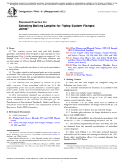 ASTM F704-81(2022) is a standard published by ASTM International. Its full title is "Standard Practice for Selecting Bolting Lengths for Piping System Flanged Joints". This standard covers: ABSTRACT This practice covers bolt and stud bolt lengths, quantities, and thread series for pipe to pipe and pipe to valve flanged joints. This specification presents tables of bolting lengths for different steel flanged joints. SCOPE 1.1 This practice covers bolt and stud bolt lengths, quantities, and thread series for pipe to pipe and pipe to valve flanged joints (Note 1) in the nominal pipe size ranges of 1/2 in. through 48 in. (12.7 mm through 1219 mm) diameter and pressure range of 125 psi through 2500 psi (0.8 kPa through 17 236 kPa). Note 1: This is applicable when flange of valve has the same thickness as mating flange. 1.2 The values stated in inch-pound units are to be regarded as standard. The values given in parentheses are mathematical conversions to SI units that are provided for information only and are not considered standard. 1.3 This standard does not purport to address all of the safety concerns, if any, associated with its use. It is the responsibility of the user of this standard to establish appropriate safety, health, and environmental practices and determine the applicability of regulatory limitations prior to use. 1.4 This international standard was developed in accordance with internationally recognized principles on standardization established in the Decision on Principles for the Development of International Standards, Guides and Recommendations issued by the World Trade Organization Technical Barriers to Trade (TBT) Committee.