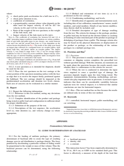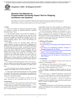 ASTM D4003-98(2019)e1 is a standard published by ASTM International. Its full title is "Standard Test Methods for Programmable Horizontal Impact Test for Shipping Containers and Systems". This standard covers: SIGNIFICANCE AND USE 4.1 These test methods provide a measure of a shipping container's ability to protect a product from failure due to horizontal impacts. These measures are based on controlled levels of shock input and may be used for arriving at the optimum design of a container or system to protect a product against a specified level of shipping environment hazard. 4.2 These test methods provide a measure of a packaged product's ability to withstand the various levels of shipping environment hazards. These measures may be used to prescribe a mode of shipping and handling that will not induce damage to the packaged product or to define the required levels of protection that must be provided by its packaging. 4.3 Test Method A is intended to simulate the rail car coupling environment. Refer to Methods D5277 for simulating the standard draft gear portion of that environment. SCOPE 1.1 These test methods are intended to determine the ability of a package or product to withstand laboratory simulated horizontal impact forces. 1.2 The horizontal impacts used in these test methods are programmed shock inputs that represent the hazards as they occur in the shipping and handling environments. The environmental hazards may include rail switching impacts, lift truck marshalling impacts, and so forth. The following test methods apply: 1.2.1 Method A, Rail Car Switching Impact—This test method simulates the types of shock pulses experienced by lading in rail car switching, with the use of a rigid bulkhead on the leading edge of the test carriage, to simulate the end wall of a railcar and shock programming devices to produce representative shock pulses. With the use of backloading, this test method may also be used to simulate compressive forces experienced by lading loads during rail car switching. It is suitable for tests of individual containers or systems as they are shipped in rail cars. It may also be used to evaluate the effectiveness of pallet patterns to determine the effect of interaction between containers during rail switching operation impacts. 1.2.2 Method B, Marshalling Impact Tests of Unit Loads—This test method assesses the ability of unit loads to withstand the forces encountered during marshalling or loading operations. 1.3 The test levels may be varied to represent the mode on shipping and handling used for the item under test. 1.4 The values stated in inch-pound units are to be regarded as standard. The values given in parentheses are mathematical conversions to SI units that are provided for information only and are not considered standard. 1.5 This standard does not purport to address all of the safety concerns, if any, associated with its use. It is the responsibility of the user of this standard to establish appropriate safety, health, and environmental practices and determine the applicability of regulatory limitations prior to use. 1.6 This international standard was developed in accordance with internationally recognized principles on standardization established in the Decision on Principles for the Development of International Standards, Guides and Recommendations issued by the World Trade Organization Technical Barriers to Trade (TBT) Committee.