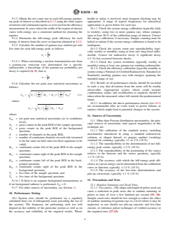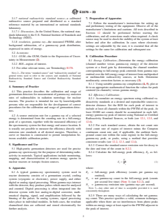 SIGNIFICANCE AND USE 5.1 High-purity germanium detectors are used for precise gamma-ray spectroscopy for the purpose of determining radioactivity in materials. Typical applications include monitoring, mapping, and characterization of neutron energy spectra in nuclear reactors or isotopic fission sources. SCOPE 1.1 This standard establishes techniques for calibration, usage, and performance testing of germanium detectors for the measurement of gamma-ray emission rates of radionuclides in radiation metrology for reactor dosimetry. The practice is applicable only to samples of small size, approximating to point sources. It covers the energy and full-energy peak efficiency calibration as well as the determination of gamma-ray energies in the 0.06 MeV to 2 MeV energy region and is designed to yield gamma-ray emission rates with an uncertainty of ±3 % (see Note 1). This technique applies to measurements that do not involve overlapping peaks, and in which peak-to-continuum considerations are not important. Note 1: Uncertainty U is given at the 68 % confidence level; that is, where δi are the estimated maximum systematic uncertainties, and σi are the random uncertainties at the 68 % confidence level. Other techniques of error analysis are in use (1, 2).2 1.2 Additional information on the setup, calibration, and quality control for radiometric detectors and measurements is given in IEEE/ANSI N42.14 and in Guide C1402 and Practice D7282. 1.3 The values stated in SI units are generally to be regarded as standard. The rad is an exception. 1.4 This standard does not purport to address all of the safety concerns, if any, associated with its use. It is the responsibility of the user of this standard to establish appropriate safety, health, and environmental practices and determine the applicability of regulatory limitations prior to use. 1.5 This international standard was developed in accordance with internationally recognized principles on standardization established in the Decision on Principles for the Development of International Standards, Guides and Recommendations issued by the World Trade Organization Technical Barriers to Trade (TBT) Committee.