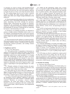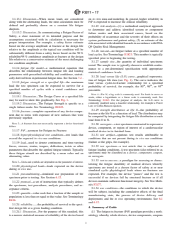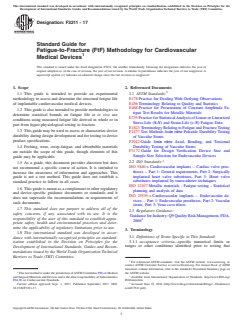 SIGNIFICANCE AND USE 5.1 Use of this Methodology: 5.1.1 This guide provides a compendium of information on methods to use fracture data, fatigue life models, and statistical techniques to estimate the structural fatigue durability of an implantable medical device under anticipated in vivo loading modes. The methodology for high-cycle fatigue assessment relies on hyper-physiological tests intended to cause device fractures. Using the FtF methodology, fractures should not be avoided during testing; instead they provide the information required to statistically assess device longevity under a wide variety of physiological and hyper-physiological test conditions. 5.1.2 Through evaluation of fracture locations, the geometries after fractures, and the use conditions of the device, this guide may be used to help assess device safety. 5.1.3 This guide may be used to help assess differences in fatigue life between different devices or device histories. The effects on fatigue life due to changes to a device’s geometry, processing, or material may be assessed using this guide. 5.1.4 Users of this guide must keep in mind that bench tests are simulations of in-use conditions. Adherence to this guide may not guarantee that results translate to individual clinical scenarios. Therefore, in assessing a device’s fatigue performance, the results from Fatigue to Fracture testing should be reviewed in combination with other available data, such as animal studies, clinical experience, and computational simulations. 5.2 Significance of this Methodology: 5.2.1 While the FtF methodology applies only to bench tests, it can provide insights into device behavior that would not necessarily be apparent in clinical studies that typically focus on patient outcomes. After appropriate boundary conditions such as loadings, fixturing, and materials have been determined, the FtF methodology can provide extensive information on the expected longevity of a device in a period 10 to 1000 times shorter than ... SCOPE 1.1 This guide is intended to provide an experimental methodology to assess and determine the structural fatigue life of implantable cardiovascular medical devices. 1.2 This guide is also intended to provide methodologies to determine statistical bounds on fatigue life at in vivo use conditions using measured fatigue life derived in whole or in part from hyper-physiological testing to fracture. 1.3 This guide may be used to assess or characterize device durability during design development and for testing to device product specifications. 1.4 Fretting, wear, creep-fatigue, and absorbable materials are outside the scope of this guide, though elements of this guide may be applicable. 1.5 As a guide, this document provides direction but does not recommend a specific course of action. It is intended to increase the awareness of information and approaches. This guide is not a test method. This guide does not establish a standard practice to follow in all cases. 1.6 This guide is meant as a complement to other regulatory and device-specific guidance documents or standards and it does not supersede the recommendations or requirements of such documents. 1.7 This standard does not purport to address all of the safety concerns, if any, associated with its use. It is the responsibility of the user of this standard to establish appropriate safety, health and environmental practices and determine the applicability of regulatory limitations prior to use. 1.8 This international standard was developed in accordance with internationally recognized principles on standardization established in the Decision on Principles for the Development of International Standards, Guides and Recommendations issued by the World Trade Organization Technical Barriers to Trade (TBT) Committee.