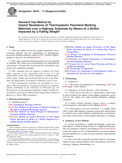 ASTM D8161-17(2022) is a standard published by ASTM International. Its full title is "Standard Test Method for Impact Resistance of Thermoplastic Pavement Marking Materials over a Highway Substrate by Means of a Striker Impacted by a Falling Weight". This standard covers: SIGNIFICANCE AND USE 5.1 The significance of this test is to determine the thermoplastic pavement marking material’s resistance to impact over a simulated pavement substrate, under laboratory conditions, and is expressed as pass/fail or numerically. The test result can be used as a quality test or to differentiate marking materials. 5.2 Anyone attempting to perform this test should initially review Test Methods D5420 and D2794, specifically the equipment setup. 5.3 Sample preparation and equipment set-up should be followed precisely to minimize variability in the test result. SCOPE 1.1 This test method covers the sample preparation over a road-type substrate and test methodology of thermoplastic pavement marking materials similar to the “Gardner Impact” method as listed in Test Method D5420. 1.2 The values stated in inch-pound units are to be regarded as standard. The values given in parentheses are mathematical conversions to SI units that are provided for information only and are not considered standard. 1.3 This standard does not purport to address all of the safety concerns, if any, associated with its use. It is the responsibility of the user of this standard to establish appropriate safety, health, and environmental practices and determine the applicability of regulatory limitations prior to use. 1.4 This international standard was developed in accordance with internationally recognized principles on standardization established in the Decision on Principles for the Development of International Standards, Guides and Recommendations issued by the World Trade Organization Technical Barriers to Trade (TBT) Committee.