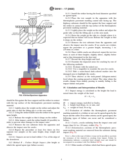 SIGNIFICANCE AND USE 5.1 The significance of this test is to determine the thermoplastic pavement marking material’s resistance to impact over a simulated pavement substrate, under laboratory conditions, and is expressed as pass/fail or numerically. The test result can be used as a quality test or to differentiate marking materials. 5.2 Anyone attempting to perform this test should initially review Test Methods D5420 and D2794, specifically the equipment setup. 5.3 Sample preparation and equipment set-up should be followed precisely to minimize variability in the test result. SCOPE 1.1 This test method covers the sample preparation over a road-type substrate and test methodology of thermoplastic pavement marking materials similar to the “Gardner Impact” method as listed in Test Method D5420. 1.2 The values stated in inch-pound units are to be regarded as standard. The values given in parentheses are mathematical conversions to SI units that are provided for information only and are not considered standard. 1.3 This standard does not purport to address all of the safety concerns, if any, associated with its use. It is the responsibility of the user of this standard to establish appropriate safety, health, and environmental practices and determine the applicability of regulatory limitations prior to use. 1.4 This international standard was developed in accordance with internationally recognized principles on standardization established in the Decision on Principles for the Development of International Standards, Guides and Recommendations issued by the World Trade Organization Technical Barriers to Trade (TBT) Committee.