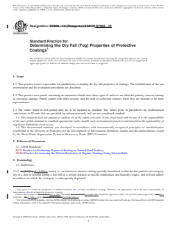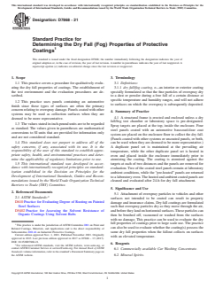 ASTM D7868-21 is a standard published by ASTM International. Its full title is "Standard Practice for Determining the Dry Fall (Fog) Properties of Protective Coatings". This standard covers: SIGNIFICANCE AND USE 5.1 Attachment of overspray particles to vehicles and other surfaces not intended to be coated can result in property damage and insurance claims. Dry fall coatings are formulated such that overspray particles dry as they move through the air, and before they land on horizontal surfaces. These particles can then be brushed off, vacuumed or washed from the surfaces with no damage. This practice can be used to evaluate the dry fall properties of coatings prior to large scale use. The practice can also be used to evaluate whether the coating(s) possess the same dry fall properties when the fallout collects on surfaces with an elevated temperature. SCOPE 1.1 This practice covers a procedure for qualitatively evaluating the dry fall properties of coatings. The establishment of the test environment and the evaluation procedures are described. 1.2 This practice uses panels containing an automotive finish since these types of surfaces are often the primary concern relating to overspray damage. Panels coated with other systems may be used as collection surfaces when they are deemed to be more representative. 1.3 The values stated in inch-pound units are to be regarded as standard. The values given in parentheses are mathematical conversions to SI units that are provided for information only and are not considered standard. 1.4 This standard does not purport to address all of the safety concerns, if any, associated with its use. It is the responsibility of the user of this standard to establish appropriate safety, health, and environmental practices and determine the applicability of regulatory limitations prior to use. 1.5 This international standard was developed in accordance with internationally recognized principles on standardization established in the Decision on Principles for the Development of International Standards, Guides and Recommendations issued by the World Trade Organization Technical Barriers to Trade (TBT) Committee.