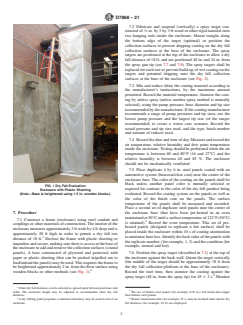 SIGNIFICANCE AND USE 5.1 Attachment of overspray particles to vehicles and other surfaces not intended to be coated can result in property damage and insurance claims. Dry fall coatings are formulated such that overspray particles dry as they move through the air, and before they land on horizontal surfaces. These particles can then be brushed off, vacuumed or washed from the surfaces with no damage. This practice can be used to evaluate the dry fall properties of coatings prior to large scale use. The practice can also be used to evaluate whether the coating(s) possess the same dry fall properties when the fallout collects on surfaces with an elevated temperature. SCOPE 1.1 This practice covers a procedure for qualitatively evaluating the dry fall properties of coatings. The establishment of the test environment and the evaluation procedures are described. 1.2 This practice uses panels containing an automotive finish since these types of surfaces are often the primary concern relating to overspray damage. Panels coated with other systems may be used as collection surfaces when they are deemed to be more representative. 1.3 The values stated in inch-pound units are to be regarded as standard. The values given in parentheses are mathematical conversions to SI units that are provided for information only and are not considered standard. 1.4 This standard does not purport to address all of the safety concerns, if any, associated with its use. It is the responsibility of the user of this standard to establish appropriate safety, health, and environmental practices and determine the applicability of regulatory limitations prior to use. 1.5 This international standard was developed in accordance with internationally recognized principles on standardization established in the Decision on Principles for the Development of International Standards, Guides and Recommendations issued by the World Trade Organization Technical Barriers to Trade (TBT) Committee.