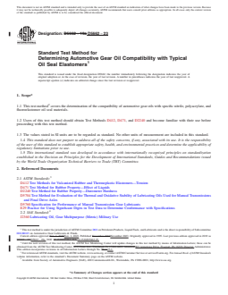SIGNIFICANCE AND USE 5.1 There are several major causes of automotive lubricant-related seal failures. This test method addresses only those failures caused by excessive elastomer hardening, elongation loss, and volume swell and attempts to determine the likelihood that an oil might cause premature sealing system failures in field use. This test method may be used as a requirement of a performance specification, such as Specification D5760 and J2360. 5.2 Another major cause of seal failure is the formation of carbon, varnish, and sludge-like deposits on the seal lip. The deposit-forming characteristics of automotive gear oils are evaluated in Test Method D5704. That procedure is intended in part to evaluate the potential for oils to cause premature seal failure in field service. SCOPE 1.1 This test method2 covers the determination of the compatibility of automotive gear oils with specific nitrile, polyacrylate, and fluoroelastomer oil seal materials. 1.2 Users of this test method should obtain Test Methods D412, D471, and D2240 and become familiar with their use before proceeding with this test method. 1.3 The values stated in SI units are to be regarded as standard. No other units of measurement are included in this standard. 1.4 This standard does not purport to address all of the safety concerns, if any, associated with its use. It is the responsibility of the user of this standard to establish appropriate safety, health, and environmental practices and determine the applicability of regulatory limitations prior to use. 1.5 This international standard was developed in accordance with internationally recognized principles on standardization established in the Decision on Principles for the Development of International Standards, Guides and Recommendations issued by the World Trade Organization Technical Barriers to Trade (TBT) Committee.