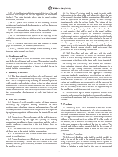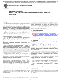 SCOPE 1.1 This practice describes methods for evaluating the shear capacity of a typical section of a framed wall, supported on a rigid foundation and having load applied in the plane of the wall along the edge opposite the rigid support and in a direction parallel to it. The objective is to provide a determination of the shear stiffness and strength of any structural light-frame wall configuration to be used as a shear-wall on a rigid support. 1.2 Limitations—This practice is not intended to be used as a basis for classifying sheathing shear capacity or as an evaluation of combined flexure and shear resulting from the wall being loaded on a flexible foundation. 1.2.1 The effect of sheathing variations is assessed by holding all other variables constant. Permitted variations in framing configuration and boundary conditions, however, require accurate documentation of the test setup to validate across-study comparisons of sheathing contribution to wall shear capacity. Note 1: A wall tested on a flexible foundation is evaluated by comparing shear stiffness and strength results to those of an identical wall tested on a rigid foundation, following this practice. However, no methods are given for the measurement of wall bending displacements or assessment of stress distribution resulting from foundation flexure. Any extrapolation of wall racking behavior from the foundation conditions specified by this practice to flexible conditions shall be done with the support of a comparative test on a representative foundation. 1.3 The values stated in SI units are to be regarded as standard. The values given in parentheses are mathematical conversions to inch-pound units that are provided for information only and are not considered standard. 1.4 This standard does not purport to address all of the safety concerns, if any, associated with its use. It is the responsibility of the user of this standard to establish appropriate safety, health, and environmental practices and determine the applicability of regulatory limitations prior to use. 1.5 This international standard was developed in accordance with internationally recognized principles on standardization established in the Decision on Principles for the Development of International Standards, Guides and Recommendations issued by the World Trade Organization Technical Barriers to Trade (TBT) Committee.