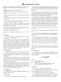 ASTM D3816/D3816M-96(2020) is a standard published by ASTM International. Its full title is "Standard Test Method for Water Penetration Rate of Pressure-Sensitive Tapes". This standard covers: SIGNIFICANCE AND USE 5.1 The results of this test method will indicate the relative permeability by water of the tape through its smallest dimension (generally normal to the tape's backing). 5.1.1 The pathway for the water parallel to the adhesive-cup interface is great compared to the tape's thickness and the latter is usually the nearly exclusive source of transmitted water. 5.1.2 Some tape types allow a relatively free path in a direction normal to the backing or along backing pathways parallel to the adhesive-cup interface, allowing the adhesive to become the principal barrier. 5.2 If the adhesive does not continue to adhere to the cup flange during the exposure periods, allowing unintended pathways for water to occur, the measurement should be considered as not having been made. Consequently, the tape might be considered as being inappropriate for use on surfaces like the cup flange under moisture conditions approximating those of the test. Note 1: It may be that the interest is simply in the tape material as a water barrier. In this case how well the tape adheres to the cup flange may be of little consequence and steps to prevent any edge effects are in order. These are referred to in Section 10. SCOPE 1.1 This test method provides one procedure for measuring the water penetration rate of 2-in. or wider pressure-sensitive tape. 1.2 The values stated in either SI or inch-pound units are to be regarded separately as standard. The values stated in each system may not be equivalent; therefore, each system must be used independently, without combining values in any way. 1.3 This standard does not purport to address all of the safety concerns, if any, associated with its use. It is the responsibility of the user of this standard to establish appropriate safety, health, and environmental practices and determine the applicability of regulatory limitations prior to use. 1.4 This international standard was developed in accordance with internationally recognized principles on standardization established in the Decision on Principles for the Development of International Standards, Guides and Recommendations issued by the World Trade Organization Technical Barriers to Trade (TBT) Committee.