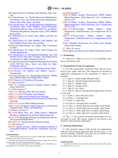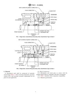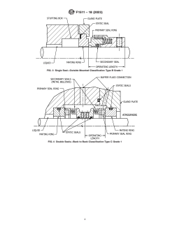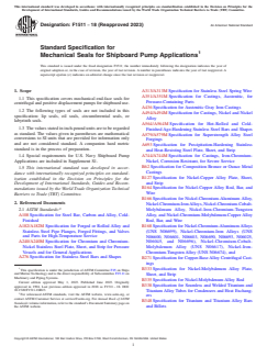 ASTM F1511-18(2023) is a technical specification published by ASTM International. Its full title is "Standard Specification for Mechanical Seals for Shipboard Pump Applications". This standard covers: ABSTRACT This specification covers mechanical end-face seals for centrifugal and positive displacement pumps for shipboard use. Mechanical seals shall be classified by type, grade, and class. Types: type A - inside single mounted seals, type B - outside single mounted seals, type C - double seals, type D - tandem seals, type E - gas seal, and type F - special arrangement/applications vacuum or gas seal. Grades: grade 1 - basic end face seal, grade 2 - cartridge seal, and grade 3 - split seal. Classes: class 0 - nonsplit seal assembly, class 1 - partial split seal assembly, solid gland, class 2 - partial split seal assembly, split gland, class 3 - fully split seal assembly, solid gland, and class 4 - fully split seal assembly, split gland. Seal life shall be defined in terms of the time period in which the mechanical seal functions properly under its specified service. SCOPE 1.1 This specification covers mechanical end-face seals for centrifugal and positive displacement pumps for shipboard use. 1.2 The following types of seals are not included in this specification: lip seals, oil seals, circumferential seals, or labyrinth seals. 1.3 The values stated in inch-pound units are to be regarded as standard. The values given in parentheses are mathematical conversions to SI units that are provided for information only and are not considered standard. A companion hard metric standard is in the process of preparation. 1.4 Special requirements for U.S. Navy Shipboard Pump Applications are included in Supplement S1. 1.5 This international standard was developed in accordance with internationally recognized principles on standardization established in the Decision on Principles for the Development of International Standards, Guides and Recommendations issued by the World Trade Organization Technical Barriers to Trade (TBT) Committee.