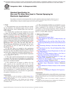 ABSTRACT This specification covers zinc and tin alloy wire, including zinc-aluminum, zinc-aluminum-copper, zinc-tin, zinc-tin-copper an dtin-zinc, used as thermal spray wire in the electronics industry. The wire shall conform to the required chemical composition for cadmium, zinc, tin, lead, antimony, copper, aluminum, bismuth, arsenic, iron, nickel, and magnesium. The wire shall be clean and free of corrosion, adhering foreign material, scale, seams, nicks, burrs, and other defects which would interfere with the operation of thermal spraying equipment. The wire shall uncoil readily and be free of bends or kinks that would prevent its passage through the thermal spray gun. Sampling methodology should ensure that the sample slected for testing is representative of the matreial. The diameter of the wire shall be determines at the end and the beginning of each continuous wire. SCOPE 1.1 This specification covers zinc and tin alloy wire, including zinc-aluminum, zinc-aluminum-copper, zinc-tin, zinc-tin-copper and tin-zinc, used as thermal spray wire in the electronics industry. 1.1.1 Certain alloys specified in this standard are also used as solders for the purpose of joining together two or more metals at temperatures below their melting points, and for other purposes (as noted in Annex A1). Specification B907 covers Zinc, Tin and Cadmium Base Alloys Used as Solders which are used primarily for the purpose of joining together two or more metals at temperatures below their melting points and for other purposes (as noted in the Annex part of Specification B907). Specification B833 covers Zinc and Zinc Alloy Wire for Thermal Spraying (Metallizing) used primarily for the corrosion protection of steel (as noted in the Annex part of Specification B833). 1.1.2 Tin base alloys are included in this specification because their use in the electronics industry is similar to the use of certain zinc alloys but different than the major use of the tin and lead solder compositions specified in Specification B32. 1.1.3 These wire alloys have a nominal liquidus temperature not exceeding 850 °F (455 °C). 1.2 The values stated in inch-pound units are to be regarded as standard. The values given in parentheses are mathematical conversions to SI units that are provided for information only and are not considered standard. 1.3 This standard does not purport to address all of the safety concerns, if any, associated with its use. It is the responsibility of the user of this standard to become familiar with all hazards including those identified in the appropriate Safety Data Sheet (SDS) for this product/material as provided by the manufacturer, to establish appropriate safety, health, and environmental practices, and determine the applicability of regulatory limitations prior to use. 1.4 This international standard was developed in accordance with internationally recognized principles on standardization established in the Decision on Principles for the Development of International Standards, Guides and Recommendations issued by the World Trade Organization Technical Barriers to Trade (TBT) Committee.