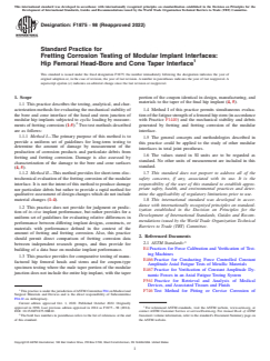 ASTM F1875-98(2022) is a standard practice developed by ASTM International that outlines procedures for fretting corrosion testing of modular implant interfaces, specifically focusing on the hip femoral head-bore and cone taper interface. Fretting corrosion is a critical issue in modular total hip replacements, as the mechanical micromotion at the head-stem junction can lead to the release of corrosion products and particulate debris, potentially causing adverse biological reactions and accelerated wear. This standard provides guidelines for both long-term and short-term testing methods designed to evaluate the mechanical stability and material performance of these interfaces under simulated physiological loading conditions.