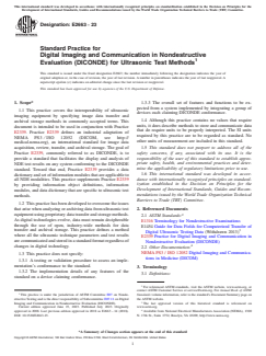 ASTM E2663-23 is a standard published by ASTM International. Its full title is "Standard Practice for Digital Imaging and Communication in Nondestructive Evaluation (DICONDE) for Ultrasonic Test Methods". This standard covers: SIGNIFICANCE AND USE 5.1 Personnel that are responsible for the creation, transfer, and storage of ultrasonic test results will use this standard. This practice defines a set of information modules that, along with Practice E2339 and the DICOM standard, provides a standard means to organize ultrasonic test parameters and results. The ultrasonic test results may be displayed and analyzed on any device that conforms to this standard. Personnel wishing to view any ultrasonic inspection data stored in DICONDE format may use this document to help them decode and display the data contained in the DICONDE compliant inspection record. SCOPE 1.1 This practice covers the interoperability of ultrasonic imaging equipment by specifying image data transfer and archival storage methods in commonly accepted terms. This document is intended to be used in conjunction with Practice E2339. Practice E2339 defines an industrial adaptation of NEMA PS3 / ISO 12052 (DICOM, see http://medical.nema.org), an international standard for image data acquisition, review, transfer, and archival storage. The goal of Practice E2339, commonly referred to as DICONDE, is to provide a standard that facilitates the display and analysis of NDE test results on any system conforming to the DICONDE standard. Toward that end, Practice E2339 provides a data dictionary and set of information modules that are applicable to all NDE modalities. This practice supplements Practice E2339 by providing information object definitions, information modules, and data dictionary that are specific to ultrasonic test methods. 1.2 This practice has been developed to overcome the issues that arise when analyzing or archiving data from ultrasonic test equipment using proprietary data transfer and storage methods. As digital technologies evolve, data must remain decipherable through the use of open, industry-wide methods for data transfer and archival storage. This practice defines a method where all the ultrasonic technique parameters and test results are communicated and stored in a standard format regardless of changes in digital technology. 1.3 This practice does not specify: 1.3.1 A testing or validation procedure to assess an implementation's conformance to the standard. 1.3.2 The implementation details of any features of the standard on a device claiming conformance. 1.3.3 The overall set of features and functions to be expected from a system implemented by integrating a group of devices each claiming DICONDE conformance. 1.4 Although this practice contains no values that require units, it does describe methods to store and communicate data that do require units to be properly interpreted. The SI units required by this practice are to be regarded as standard. No other units of measurement are included in this standard. 1.5 This standard does not purport to address all of the safety concerns, if any, associated with its use. It is the responsibility of the user of this standard to establish appropriate safety, health, and environmental practices and determine the applicability of regulatory limitations prior to use. 1.6 This international standard was developed in accordance with internationally recognized principles on standardization established in the Decision on Principles for the Development of International Standards, Guides and Recommendations issued by the World Trade Organization Technical Barriers to Trade (TBT) Committee.