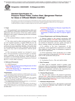 ASTM A562/A562M-10(2021) is a technical specification published by ASTM International. Its full title is "Standard Specification for Pressure Vessel Plates, Carbon Steel, Manganese-Titanium for Glass or Diffused Metallic Coatings". This standard covers: ABSTRACT This specification covers standard requirements for titanium-bearing carbon steel plates intended for welded glass lined pressure vessels or other applications where the presence of free-iron carbide would be deleterious to the coating. The steel shall be killed and thermally treated to produce the required grain refinement specification. Heat and product analyses shall be performed wherein the material shall conform to the required chemical composition for carbon, manganese, phosphorus, sulfur, silicon, copper, and titanium. The steel plate shall conform to tensile requirements such as tensile strength, yield strength, and elongation. SCOPE 1.1 This specification2 covers titanium-bearing carbon steel plates intended for welded glass lined pressure vessels or other applications where the presence of free-iron carbide would be deleterious to the coating. A minimum specific ratio of titanium to carbon is specified. 1.2 The maximum thickness of plates is limited to 2 in. [50 mm]. 1.3 The values stated in either inch-pound units or SI units are to be regarded separately as standard. Within the text, the SI units are shown in brackets. The values stated in each system are not exact equivalents; therefore, each system must be used independently of the other. Combining values from the two systems may result in nonconformance with the specification. 1.4 This international standard was developed in accordance with internationally recognized principles on standardization established in the Decision on Principles for the Development of International Standards, Guides and Recommendations issued by the World Trade Organization Technical Barriers to Trade (TBT) Committee.