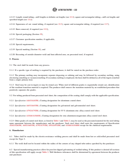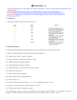 ABSTRACT This guide covers standard specification for round, square, rectangular, and special shape, electric-resistance-welded mechanical tubing, either zinc-coated (galvanized) after welding or produced from aluminum-coated, zinc-coated (galvanized), zinc-iron alloy-coated (galvannealed), or aluminum-zinc alloy-coated steel sheet. Low-carbon steels and other carbon steels shall conform to the required chemical composition for carbon, manganese, phosphorus, and sulfur. The steels shall conform to elemental tolerances for product analysis. Wall thickness tolerances for premetallic coated as-welded tubing and diameter tolerances for metallic-coated round tubing shall be provided. SCOPE 1.1 This specification covers round, square, rectangular, and special shape, electric-resistance-welded carbon steel mechanical tubing, either zinc-coated (galvanized) after welding or produced from aluminum-coated, zinc-coated (galvanized), zinc-iron alloy-coated (galvannealed), 55 % aluminum-zinc alloy-coated, or zinc-aluminum-magnesium alloy-coated carbon steel sheet. Tubing for use as electrical conduit (EMT) or intermediate metallic conduit (IMC) is not covered by this specification. 1.1.1 The product is available in various grades based on chemical requirements (Sections 5 and 9). 1.1.2 The product is available in various Types (Section 3). 1.2 This specification covers mechanical tubing with outside diameters or maximum outside dimensions ranging from 1/2 to 15 in. [12.7 to 380.0 mm] and wall thickness from 0.028 to 0.180 in. [0.70 to 4.60 mm]. Indeterminate wall thicknesses may be ordered. In those cases the more stringent tolerances of Tables 3, 4, 5, 6, 12 and 13 shall apply. 1.3 When sizes within the ranges listed above are ordered, all other requirements of the specification shall be met. 1.4 This specification is expressed in both inch-pound units and in SI units; however, unless the purchase order specifies the applicable M specification designation (SI units), the inch-pound units shall apply. The values stated in either SI units or inch-pound units are to be regarded separately as standard. Within the text, the SI units are shown in brackets. The values stated in each system may not be exact equivalents; therefore, each system shall be used independently of the other. Combining values from the two systems may result in non-conformance with the standard. 1.5 This international standard was developed in accordance with internationally recognized principles on standardization established in the Decision on Principles for the Development of International Standards, Guides and Recommendations issued by the World Trade Organization Technical Barriers to Trade (TBT) Committee.