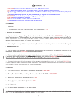 SIGNIFICANCE AND USE 5.1 This test method is of significance in making a final determination of the acceptability of fine aggregates with respect to the requirements of Specification C33/C33M concerning organic impurities. 5.2 This test method is applicable to those samples which, when tested in accordance with Test MethodC40/C40M, have produced a supernatant liquid with a color darker than the standard listed in Table 1 of C40/C40M (Organic plate No. 3, Gardner Color Standard No. 14, Circular Disk No. 14 or prepared color solution). 5.3 Many specifications provide for the acceptance of fine aggregate producing a darker color in the Test Method C40/C40M test, if testing by this test method indicates the strength of the mortar cubes prepared with the unwashed fine aggregate is comparable to the strength of mortar cubes made with the washed fine aggregate. SCOPE 1.1 This test method covers the determination of the effect on mortar strength of the organic impurities in fine aggregate, whose presence is indicated using Test Method C40/C40M. Comparison is made between compressive strengths of mortar made with washed and unwashed fine aggregate. 1.2 The values stated in either SI units or inch-pound units are to be regarded separately as standard. The values stated in each system may not be exact equivalents; therefore, each system shall be used independently of the other. Combining values from the two systems may result in non-conformance with the standard. Some values have only SI units because the inch-pound equivalents are not used in the practice. Note 1: Sieve size is identified by its standard designation in Specification E11. The alternative designation given in parentheses is for information only and does not represent a different standard sieve size 1.3 This standard does not purport to address all of the safety concerns, if any, associated with its use. It is the responsibility of the user of this standard to establish appropriate safety, health, and environmental practices and determine the applicability of regulatory limitations prior to use.(Warning—Fresh hydraulic cementitous mixtures are caustic and may cause chemical burns to exposed skin and tissue upon prolonged exposure.)2 1.4 This international standard was developed in accordance with internationally recognized principles on standardization established in the Decision on Principles for the Development of International Standards, Guides and Recommendations issued by the World Trade Organization Technical Barriers to Trade (TBT) Committee.
