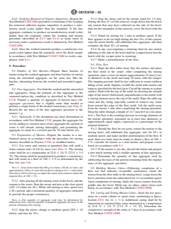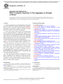 ASTM C87/C87M-23 is a standard published by ASTM International. Its full title is "Standard Test Method for Effect of Organic Impurities in Fine Aggregate on Strength of Mortar". This standard covers: SIGNIFICANCE AND USE 5.1 This test method is of significance in making a final determination of the acceptability of fine aggregates with respect to the requirements of Specification C33/C33M concerning organic impurities. 5.2 This test method is applicable to those samples which, when tested in accordance with Test MethodC40/C40M, have produced a supernatant liquid with a color darker than the standard listed in Table 1 of C40/C40M (Organic plate No. 3, Gardner Color Standard No. 14, Circular Disk No. 14 or prepared color solution). 5.3 Many specifications provide for the acceptance of fine aggregate producing a darker color in the Test Method C40/C40M test, if testing by this test method indicates the strength of the mortar cubes prepared with the unwashed fine aggregate is comparable to the strength of mortar cubes made with the washed fine aggregate. SCOPE 1.1 This test method covers the determination of the effect on mortar strength of the organic impurities in fine aggregate, whose presence is indicated using Test Method C40/C40M. Comparison is made between compressive strengths of mortar made with washed and unwashed fine aggregate. 1.2 The values stated in either SI units or inch-pound units are to be regarded separately as standard. The values stated in each system may not be exact equivalents; therefore, each system shall be used independently of the other. Combining values from the two systems may result in non-conformance with the standard. Some values have only SI units because the inch-pound equivalents are not used in the practice. Note 1: Sieve size is identified by its standard designation in Specification E11. The alternative designation given in parentheses is for information only and does not represent a different standard sieve size 1.3 This standard does not purport to address all of the safety concerns, if any, associated with its use. It is the responsibility of the user of this standard to establish appropriate safety, health, and environmental practices and determine the applicability of regulatory limitations prior to use.(Warning—Fresh hydraulic cementitous mixtures are caustic and may cause chemical burns to exposed skin and tissue upon prolonged exposure.)2 1.4 This international standard was developed in accordance with internationally recognized principles on standardization established in the Decision on Principles for the Development of International Standards, Guides and Recommendations issued by the World Trade Organization Technical Barriers to Trade (TBT) Committee.