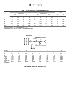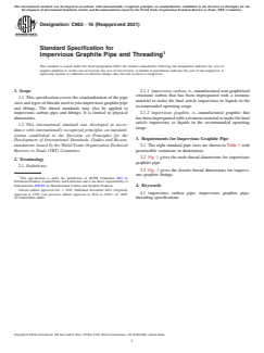 ASTM C662-16(2021) is a technical specification published by ASTM International. Its full title is "Standard Specification for Impervious Graphite Pipe and Threading". This standard covers: ABSTRACT This specification covers standardization of pipe sizes and thread types used to join impervious graphite pipe and fittings. This specification may also be applied to impervious carbon pipe and fittings. Physical dimensions of impervious graphite and carbon pipes and threads shall be within the limits indicated in this specification. SCOPE 1.1 This specification covers the standardization of the pipe sizes and types of threads used to join impervious graphite pipe and fittings. The thread standards may also be applied to impervious carbon pipe and fittings. It is limited to physical dimensions. 1.2 This international standard was developed in accordance with internationally recognized principles on standardization established in the Decision on Principles for the Development of International Standards, Guides and Recommendations issued by the World Trade Organization Technical Barriers to Trade (TBT) Committee.