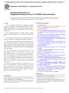 ASTM E2851/E2851M-13(2021) is a technical specification published by ASTM International. Its full title is "Standard Specification for Ruggedness Requirements for HAZMAT Instrumentation". This standard covers: ABSTRACT This specification establishes the ruggedness requirements for equipment used in Hazardous Material (HAZMAT) instrumentation, including devices used to detect or monitor for hazardous material. It defines for design and test purposes the environment in which HAZMAT equipment will likely be exposed during storage, transport, and field use. Passive personal protective equipment such as respirators and protective suits are not covered. The specification addresses materials and manufacture, physical and mechanical properties, performance and environmental requirements, dimensions, mass and permissible variations, workmanship, and finish and appearance. Definitions of terms specific to this standard are provided, including body-worn, hand-carried, mobile, portable, and transportable. SCOPE 1.1 This specification describes the ruggedness requirements for equipment used during Hazardous Material (HAZMAT) operations. The conditions defined by this specification include those related to equipment storage, transport, and field use. 1.2 This specification does not address passive personal protective equipment (PPE) such as respirators and protective suits. 1.3 The equipment addressed by this specification includes devices used to detect or monitor for hazardous material. 1.4 The values stated in either SI units or inch-pound units are to be regarded separately as standard. The values stated in each system may not be exact equivalents; therefore, each system shall be used independently of the other. Combining values from the two systems may result in non-conformance with the standard. 1.5 This standard does not purport to address all of the safety concerns, if any, associated with its use. It is the responsibility of the user of this standard to establish appropriate safety, health, and environmental practices and determine the applicability of regulatory limitations prior to use. When using a HAZMAT instrument, follow the manufacturer’s guidance and appropriate safety practices for the threat expected or suspected in the environment where the instrument will be used. 1.6 This international standard was developed in accordance with internationally recognized principles on standardization established in the Decision on Principles for the Development of International Standards, Guides and Recommendations issued by the World Trade Organization Technical Barriers to Trade (TBT) Committee.