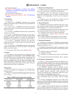 ABSTRACT This specification establishes the ruggedness requirements for equipment used in Hazardous Material (HAZMAT) instrumentation, including devices used to detect or monitor for hazardous material. It defines for design and test purposes the environment in which HAZMAT equipment will likely be exposed during storage, transport, and field use. Passive personal protective equipment such as respirators and protective suits are not covered. The specification addresses materials and manufacture, physical and mechanical properties, performance and environmental requirements, dimensions, mass and permissible variations, workmanship, and finish and appearance. Definitions of terms specific to this standard are provided, including body-worn, hand-carried, mobile, portable, and transportable. SCOPE 1.1 This specification describes the ruggedness requirements for equipment used during Hazardous Material (HAZMAT) operations. The conditions defined by this specification include those related to equipment storage, transport, and field use. 1.2 This specification does not address passive personal protective equipment (PPE) such as respirators and protective suits. 1.3 The equipment addressed by this specification includes devices used to detect or monitor for hazardous material. 1.4 The values stated in either SI units or inch-pound units are to be regarded separately as standard. The values stated in each system may not be exact equivalents; therefore, each system shall be used independently of the other. Combining values from the two systems may result in non-conformance with the standard. 1.5 This standard does not purport to address all of the safety concerns, if any, associated with its use. It is the responsibility of the user of this standard to establish appropriate safety, health, and environmental practices and determine the applicability of regulatory limitations prior to use. When using a HAZMAT instrument, follow the manufacturer’s guidance and appropriate safety practices for the threat expected or suspected in the environment where the instrument will be used. 1.6 This international standard was developed in accordance with internationally recognized principles on standardization established in the Decision on Principles for the Development of International Standards, Guides and Recommendations issued by the World Trade Organization Technical Barriers to Trade (TBT) Committee.