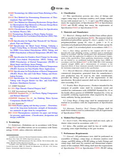 This specification covers fittings molded from specific sulfone plastics, which must resist cracking, splitting, or shattering. It also details requirements for copper crimp rings and stainless steel clamps, ensuring reliable connections in residential, commercial, and municipal water environments.