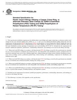 ASTM F2159-23a is a technical specification published by ASTM International. Its full title is "Standard Specification for Plastic Insert Fittings Utilizing a Copper Crimp Ring, or Alternate Stainless Steel Clamps for SDR9 Crosslinked Polyethylene (PEX) Tubing and SDR9 Polyethylene of Raised Temperature (PE-RT) Tubing". This standard covers: ABSTRACT This specification establishes requirements for sulfone plastic insert fittings utilizing a copper crimp ring for SDR9 cross-linked polyethylene (PEX) tubing for cold- and hot-water distribution systems. Material for fitting shall be molded from sulfone plastic. Molded part shall not crack, split, or shatter and be free of visible splay. Fittings shall be tested for performance requirements such as hydrostatic burst, hydrostatic sustained pressure strength, thermocycling, excessive temperature-pressure capability, dimensions, workmanship, finish, appearance, assembly, crimp joint, and insert crush test. SCOPE 1.1 This specification establishes requirements for sulfone plastic insert fittings and copper crimp rings, or alternate stainless steel clamps for four sizes Nominal Tubing Sizes (NTS) (3/8 , 1/2 , 3/4 , and 1) of cross-linked polyethylene (PEX) tubing that meet the requirements for Specification F876 or Specification F3253, or polyethylene of raised temperature (PE-RT) tubing that meet the requirements of Specification F2623 or Specification F2769. These fittings are intended for use in 100 psi (690 kPa) cold- and hot-water distribution systems operating at temperatures up to and including 180 °F (82 °C). Included are the requirements for material, molded part properties, performance, workmanship, dimensions, and markings to be used on the fittings and rings. 1.1.1 When used with PEX tubing in accordance with Specification F876, the fittings covered by this specification are intended for use in, but not limited to, residential and commercial, hot- and cold-potable water distribution systems, reclaimed water, fire protection, municipal water service lines, building supply lines, radiant heating and cooling systems, hydronic distribution systems, snow and ice melting systems, geothermal ground loops, district heating, turf conditioning, compressed air distribution, and building services pipe. 1.1.2 When used with PEX tubing in accordance with Specification F3253, the fittings covered by this specification are intended for use in residential and commercial hydronic heating and cooling systems. 1.1.3 When used with PE-RT tubing in accordance with Specification F2769, the fittings covered by this specification are intended for use in residential and commercial, hot- and cold-potable water distribution systems, and building supply lines. 1.1.4 When used with PE-RT tubing in accordance with Specification F2623, the fittings covered by this specification are intended for use in general fluid transport, including hydronics and irrigations systems. 1.2 Included are the requirements for material, molded part properties, performance, workmanship, dimensions, and markings to be used on the fittings and rings. 1.3 The following is an index of the appendix in this specification: GO/NO-GO Crimp Gauges Appendix X1 1.4 Units—The values stated in inch-pound units are to be regarded as standard. The values given in parentheses are mathematical conversions to SI units that are provided for information only and are not considered standard. 1.5 The following precautionary caveat pertains only to the test method portions, Sections 11 and 12, of this specification. This standard does not purport to address all of the safety concerns, if any, associated with its use. It is the responsibility of the user of this standard to establish appropriate safety, health, and environmental practices and determine the applicability of regulatory limitations prior to use. 1.6 This international standard was developed in accordance with internationally recognized principles on standardization established in the Decision on Principles for the Development of International Standards, Guides and Recommendations issued by the World Trade Organization Technical Barriers to Trade (TBT) Committee.
