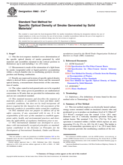 SIGNIFICANCE AND USE 5.1 This test method provides a means for determining the specific optical density of the smoke generated by specimens of materials and assemblies under the specified exposure conditions. Values determined by this test are specific to the specimen or assembly in the form and thickness tested and are not to be considered inherent fundamental properties of the material tested. Thus, it is likely that closely repeatable or reproducible experimental results are not to be expected from tests of a given material when specimen thickness, density, or other variables are involved. 5.2 The photometric scale used to measure smoke by this test method is similar to the optical density scale for human vision. However, physiological aspects associated with vision are not measured by this test method. Correlation with measurements by other test methods has not been established.5 5.3 At the present time no basis is provided for predicting the density of smoke generated by the materials upon exposure to heat and flame under other fire conditions. 5.4 The test method is of a complex nature and the data obtained are sensitive to variations which in other test methods might be considered to be insignificant (see Section 6). A precision statement based on the results of a round-robin test by a prior draft version of this test method is given in 14.1 5.5 In this procedure, the specimens are subjected to one or more specific sets of laboratory test conditions. If different test conditions are substituted or the end-use conditions are changed, it is not always possible by or from this test method to predict changes in the fire-test-response characteristics measured. Therefore, the results are valid only for the fire test exposure conditions described in this procedure. SCOPE 1.1 This fire-test-response standard covers determination of the specific optical density of smoke generated by solid materials and assemblies mounted in the vertical position in thicknesses up to and including 1 in. (25.4 mm). 1.2 Measurement is made of the attenuation of a light beam by smoke (suspended solid or liquid particles) accumulating within a closed chamber due to nonflaming pyrolytic decomposition and flaming combustion. 1.3 Results are expressed in terms of specific optical density which is derived from a geometrical factor and the measured optical density, a measurement characteristic of the concentration of smoke. 1.4 The values stated in inch-pound units are to be regarded as standard. The values given in parentheses are mathematical conversions to SI units that are provided for information only and are not considered standard. 1.5 This standard measures and describes the response of materials, products, or assemblies to heat and flame under controlled conditions, but does not by itself incorporate all factors required for fire hazard or fire risk assessment of the materials, products or assemblies under actual fire conditions. 1.6 This standard does not purport to address all of the safety concerns, if any, associated with its use. It is the responsibility of the user of this standard to establish appropriate safety, health, and environmental practices and determine the applicability of regulatory limitations prior to use. 1.7 This international standard was developed in accordance with internationally recognized principles on standardization established in the Decision on Principles for the Development of International Standards, Guides and Recommendations issued by the World Trade Organization Technical Barriers to Trade (TBT) Committee.