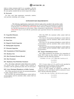 - Supplementary Requirements: Includes options for enhanced chemical limits, post-weld heat treatment, additional non-destructive testing, and specialized requirements upon agreement.