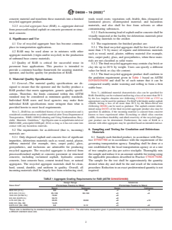 SIGNIFICANCE AND USE 4.1 Use of recycled aggregate base has become commonplace in transportation applications. 4.2 RAB may be used alone or in mixtures with other aggregate materials (virgin and/or recycled) in the production of unbound base course materials. 4.3 Quality of RAB is critical for successful reuse in pavement base applications. This practice is intended to provide a common baseline framework for assuring material, operator, and facility quality for production of RAB. SCOPE 1.1 This practice covers selected aspects for reclamation of recycled aggregate base (RAB) material derived from asphalt pavement or concrete. RAB may be called recycled asphalt pavement (RAP) or recycled concrete aggregate (RCA). 1.2 This practice is provided related to material quality, material quality control testing, and also operator and facility qualifications. 1.3 Units—The values stated in SI units are to be regarded as the standard. No other units of measurement are included in this standard. Note 1: Sieve size is identified by its standard designation in Specification E11. The alternative designation given in parentheses is for information only and does not represent a different standard sieve size. 1.4 This practice offers a set of instructions for performing one or more specific operations. This document cannot replace education or experience and should be used in conjunction with professional judgment. Not all aspects of this practice may be applicable in all circumstances. This ASTM standard is not intended to represent or replace the standard of care by which the adequacy of a given professional service must be judged, nor should this document be applied without consideration of a project’s many unique aspects. The word “Standard” in the title means only that the document has been approved through the ASTM consensus process. 1.5 This standard does not purport to address all of the safety concerns, if any, associated with its use. It is the responsibility of the user of this standard to establish appropriate safety, health, and environmental practices and determine the applicability of regulatory limitations prior to use. 1.6 This international standard was developed in accordance with internationally recognized principles on standardization established in the Decision on Principles for the Development of International Standards, Guides and Recommendations issued by the World Trade Organization Technical Barriers to Trade (TBT) Committee.