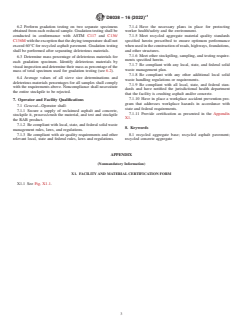 ASTM D8038-16(2022)e1 is a standard published by ASTM International. Its full title is "Standard Practice for Reclamation of Recycled Aggregate Base (RAB) Material". This standard covers: SIGNIFICANCE AND USE 4.1 Use of recycled aggregate base has become commonplace in transportation applications. 4.2 RAB may be used alone or in mixtures with other aggregate materials (virgin and/or recycled) in the production of unbound base course materials. 4.3 Quality of RAB is critical for successful reuse in pavement base applications. This practice is intended to provide a common baseline framework for assuring material, operator, and facility quality for production of RAB. SCOPE 1.1 This practice covers selected aspects for reclamation of recycled aggregate base (RAB) material derived from asphalt pavement or concrete. RAB may be called recycled asphalt pavement (RAP) or recycled concrete aggregate (RCA). 1.2 This practice is provided related to material quality, material quality control testing, and also operator and facility qualifications. 1.3 Units—The values stated in SI units are to be regarded as the standard. No other units of measurement are included in this standard. Note 1: Sieve size is identified by its standard designation in Specification E11. The alternative designation given in parentheses is for information only and does not represent a different standard sieve size. 1.4 This practice offers a set of instructions for performing one or more specific operations. This document cannot replace education or experience and should be used in conjunction with professional judgment. Not all aspects of this practice may be applicable in all circumstances. This ASTM standard is not intended to represent or replace the standard of care by which the adequacy of a given professional service must be judged, nor should this document be applied without consideration of a project’s many unique aspects. The word “Standard” in the title means only that the document has been approved through the ASTM consensus process. 1.5 This standard does not purport to address all of the safety concerns, if any, associated with its use. It is the responsibility of the user of this standard to establish appropriate safety, health, and environmental practices and determine the applicability of regulatory limitations prior to use. 1.6 This international standard was developed in accordance with internationally recognized principles on standardization established in the Decision on Principles for the Development of International Standards, Guides and Recommendations issued by the World Trade Organization Technical Barriers to Trade (TBT) Committee.