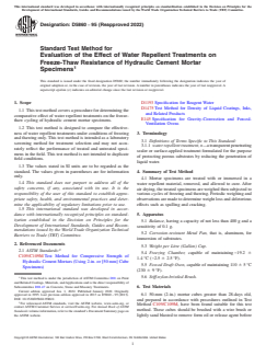 Keywords: ASTM D5860, freeze-thaw resistance, water repellent treatments, hydraulic cement mortar, concrete durability, laboratory test method, spalling, cracking, construction materials standard.