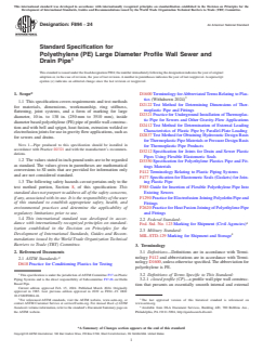 ASTM F894-24: Standard Specification for Polyethylene (PE) Large Diameter Profile Wall Sewer and Drain Pipe is an internationally recognized standard developed by ASTM International. It sets forth comprehensive requirements for materials, dimensions, workmanship, ring stiffness, flattening, and joint systems, along with prescribed methods for pipe marking. This specification is intended for polyethylene (PE) pipe of profile wall construction with inside diameters ranging from 10 inches to 138 inches (250 mm to 3510 mm) and covers a variety of joint types including bell and spigot, heat fusion, extrusion welded, and electrofusion joints. The standard aims to ensure the suitability of PE profile wall pipes for gravity-flow applications, primarily used in sewers and drains.