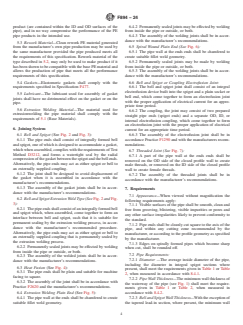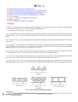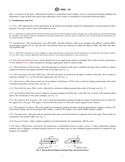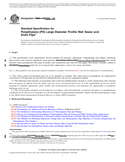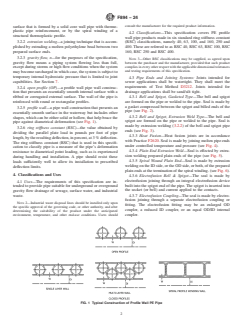 ABSTRACT This specification covers requirements and test methods for materials, dimensions, workmanship, ring stiffness, flattening, joint systems, and a form of marking for polyethylene (PE) pipe of profile wall construction and with bell and spigot, heat fusion, extrusion welded or electrofusion joints for use in gravity flow applications, such as for sewers and drains. The PE profile wall pipe products cover six standard ring stiffness constant (RSC) classifications, namely 40, 63, 100, and 160, 250 and 400. These are referred to as RSC 40, RSC 63, RSC 100, RSC 160, RSC 250 and RSC 400. Referee testing, ring stiffness constant testing, flattening test, and joint tightness test shall be performed to meet the requirements prescribed. SCOPE 1.1 This specification covers requirements and test methods for materials, dimensions, workmanship, ring stiffness, flattening, joint systems, and a form of marking for large diameter, 10 in. to 138 in. (250 mm to 3510 mm), inside diameter based polyethylene (PE) pipe of profile wall construction and with bell and spigot, heat fusion, extrusion welded or electrofusion joints for use in gravity flow applications, such as for sewers and drains. Note 1: Pipe produced to this specification should be installed in accordance with Practice D2321 and with the manufacturer's recommendations. 1.2 The values stated in inch-pound units are to be regarded as standard. The values given in parentheses are mathematical conversions to SI units that are provided for information only and are not considered standard. 1.3 The following safety hazards caveat pertains only to the test method portion, Section 8, of this specification: This standard does not purport to address all of the safety concerns, if any, associated with its use. It is the responsibility of the user of this standard to establish appropriate safety, health, and environmental practices and determine the applicability of regulatory limitations prior to use. 1.4 This international standard was developed in accordance with internationally recognized principles on standardization established in the Decision on Principles for the Development of International Standards, Guides and Recommendations issued by the World Trade Organization Technical Barriers to Trade (TBT) Committee.
