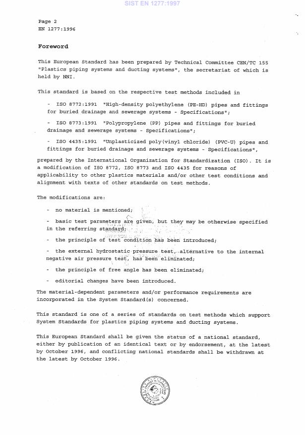 EN 1277:1996 is a standard published by the European Committee for Standardization (CEN). Its full title is "Plastics piping systems - Thermoplastics piping systems for buried non-pressure applications - Test methods for leaktightness of elastomeric sealing ring type joints". This standard covers: This standard specifies three basic test methods for determining the leaktightness of elastomeric sealing ring type joints for buried thermoplastics non-pressure piping systems. It also gives a combined test method where the three methods are executed successively. Unless otherwise specified in the referring standard, the methods use the following pressures respectively: - method 1: a low internal hydrostatic pressure for assessing leaktightness; - method 2: a higher internal hydrostatic pressure for assessing performance; - method 3: internal negative air pressure (partial vacuum).