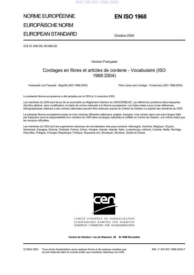 EN ISO 1968:2004 is a standard published by the European Committee for Standardization (CEN). Its full title is "Fibre ropes and cordage - Vocabulary (ISO 1968:2004)". This standard covers: ISO 1968:2004 specifies vocabulary relating to fibre ropes and cordage.