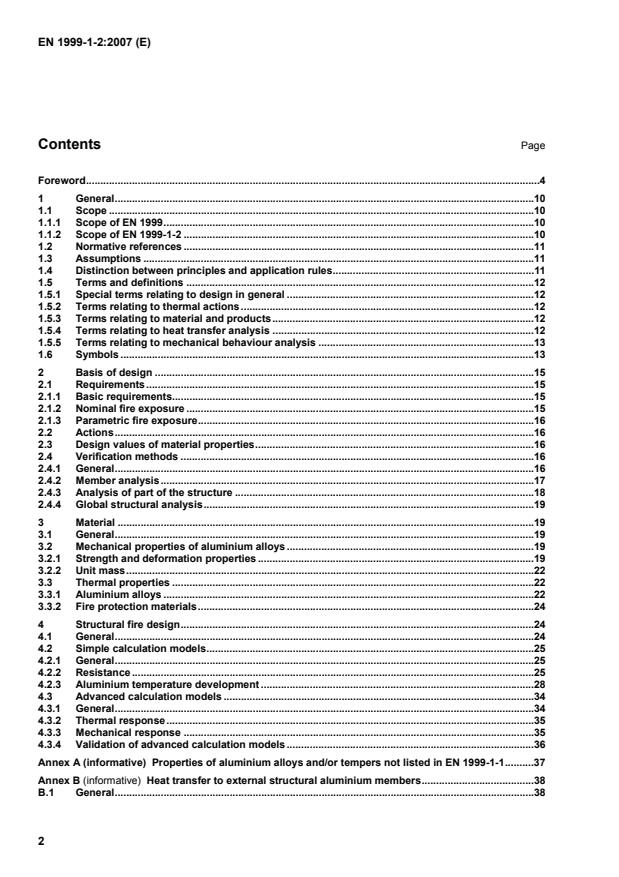 (7) The methods given in EN 1999-1-2 are applicable also to the other aluminium alloy/tempers of EN 1999-1-1 if reliable material properties at elevated temperatures are available or the simplified assumptions in 3.2.1 are applied. 1.2 Normative references (1) This European Standard incorporates by dated or undated reference, provisions from other publications. These normative references are cited at the appropriate places in the text and the publications are listed hereafter. For dated references, subsequent amendments to or revisions of any of these publications apply to this European Standard only if incorporated in it by amendment or revision. For undated references the latest edition of the publication referred to applies (including amendments). EN 485-2 Aluminium and aluminium alloys. Sheet, strip and plate. Part 2: Mechanical properties EN 755-2 Aluminium and aluminium alloys. Extruded rod/bar, tube and profiles. Part 2: Mechanical properties EN 1990 Basis of structural design EN 1991-1-2 Basis of design and actions on structures Part 1-2: Actions on structures exposed to fire EN 1999-1-1 Design of aluminium structures: Part 1-1: General structural rules EN 1090-36 Execution of steel structures and aluminium structures – Part 3: Technical requirements for aluminium structures EN 13501-2 Fire classification of construction products and building elements. Part 2 Classification using data from fire resistance tests ENV 13381-1 Fire tests on elements of building construction: Part 1: Test method for determining the contribution to the fire resistance of structural members: By horizontal protective mem-branes ENV 13381-2 Fire tests on elements of building construction. Part 2: Test method for determining the contribution to the fire resistance of structural members: By vertical protective membranes. ENV 13381-4 Fire tests on elements of building construction. Part 4: Test method for determining the contribution to the fire resistance of structural members: By applied protection to steel structural elements. 1.3 Assumptions (1) In addition to the general assumptions of EN 1990 the following assumption applies: Any passive fire protection systems taken into account in the design will be adequately maintained. 1.4 Distinction between principles and application rules (1) The rules given in EN 1990 1.4 apply.