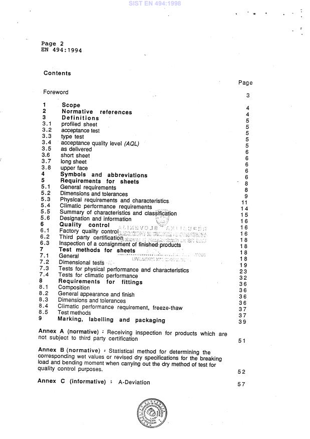EN 494:1994 is a standard published by the European Committee for Standardization (CEN). Its full title is "Fibre-cement profiled sheets and fittings for roofing - Product specification and test methods". This standard covers: This standard specifies the technical requirements and establishes methods of control and tests as well as acceptance conditions for fibre-cement profiled sheets and their fibre-cement fittings for roofing. For the purpose of this standard, fibre-cement profiled sheets are classified according to their height of corrugation and their mechanical characteristics allowing loadbearing. It identifies the water tightness.
