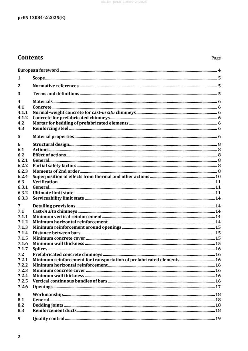 prEN 13084-2 is a draft published by the European Committee for Standardization (CEN). Its full title is "Free-standing chimneys - Part 2: Concrete chimneys". This standard covers: This document specifies particular requirements and performance criteria for the design and construction of cast-in situ concrete chimneys as well as prefabricated concrete chimneys. It identifies requirements to ensure the mechanical resistance and stability of concrete chimneys in accordance with the general requirements given in EN 13084-1:2025. As for chimneys attached to buildings the criteria given in Clause 1 of EN 13084-1:2025 apply. Unless otherwise stated in the following clauses the basic standard for the design of concrete structures, EN 1992-1-1:2023 applies.