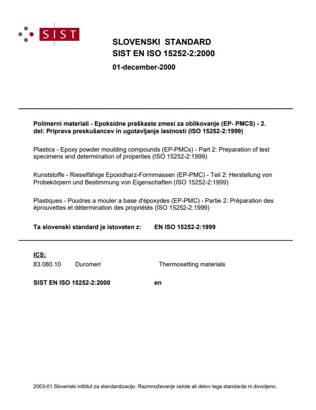 Polimerni materiali - Epoksidne praškaste zmesi za oblikovanje (EP- PMCS) - 2. del: Priprava preskušancev in ugotavljanje lastnosti (ISO 15252-2:1999)