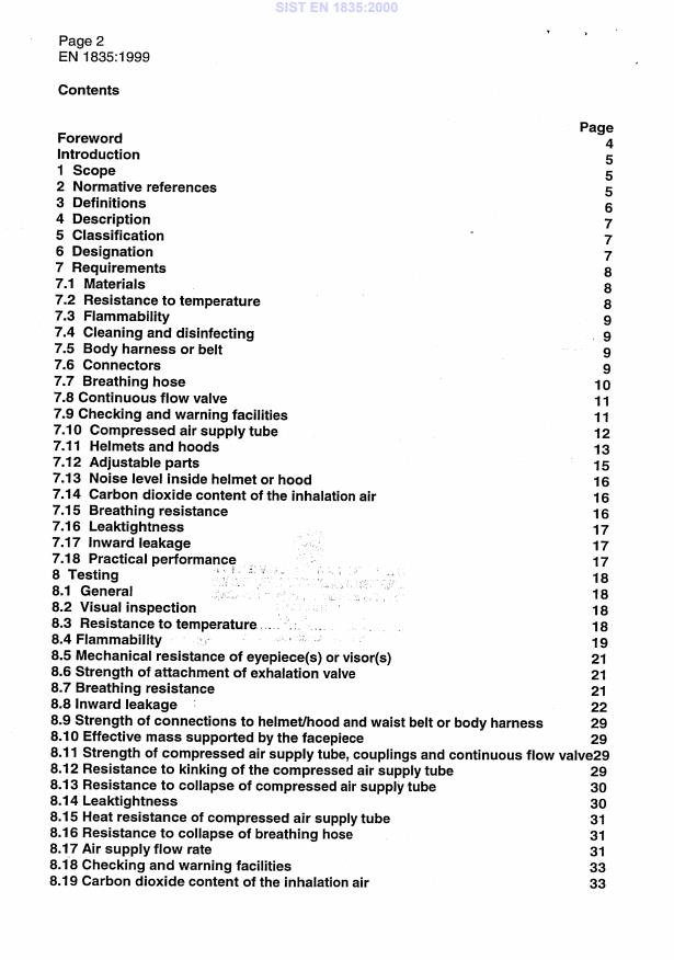 EN 1835:1999 is a standard published by the European Committee for Standardization (CEN). Its full title is "Respiratory protective devices - Light duty construction compressed air line breathing apparatus incorporating a helmet or a hood - Requirements, testing, marking". This standard covers: This European Standard specifies the minimum requirements for light duty construction compressed air line breathing apparatus incorporating a helmet or a hood which is intended for use in gaseous, particulate or combined contaminated atmospheres. Such equipment is intended for use in work situations where the risk of damage to the compressed air supply tube is low. Escape and diving apparatus, and apparatus used in abrasive blasting operations are not included. Laboratory and practical performance tests are included for the assessment of compliance with the requirements.