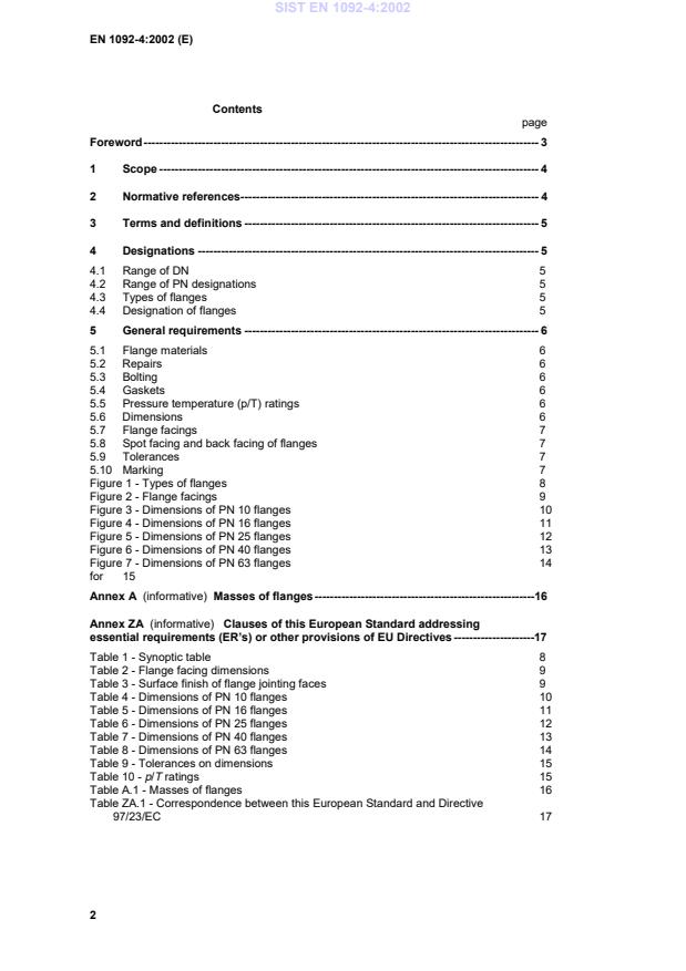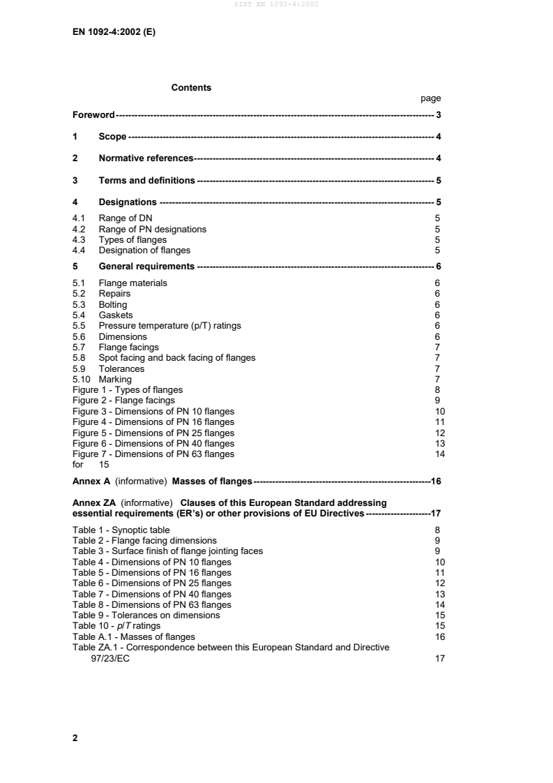Clauses of this European Standard addressingessential requirements (ER’s) or other provisions of EU Directives---------------------17Table 1 - Synoptic table8Table 2 - Flange facing dimensions9Table 3 - Surface finish of flange jointing faces9Table 4 - Dimensions of PN 10 flanges10Table 5 - Dimensions of PN 16 flanges11Table 6 - Dimensions of PN 25 flanges12Table 7 - Dimensions of PN 40 flanges13Table 8 - Dimensions of PN 63 flanges14Table 9 - Tolerances on dimensions15Table 10 - p/T ratings15Table A.1 - Masses of flanges16Table ZA.1 - Correspondence between this European Standard and Directive97/23/EC17SIST EN 1092-4:2002