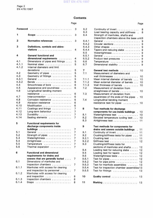 EN 476:1997 is a standard published by the European Committee for Standardization (CEN). Its full title is "General requirements for components used in discharge pipes, drains and sewers for gravity systems". This standard covers: This European standard specifies general requirements for components such as pipes, fitting, and manholes with their respective joints intended for use in discharge pipes, drains and sewers which operate as gravity systems where any pressure likely to occur is a maximum of 40 kPa. This European standard providesthe general basis for the preparation or revision of product standards. It is not applicable for the evaluation of products.