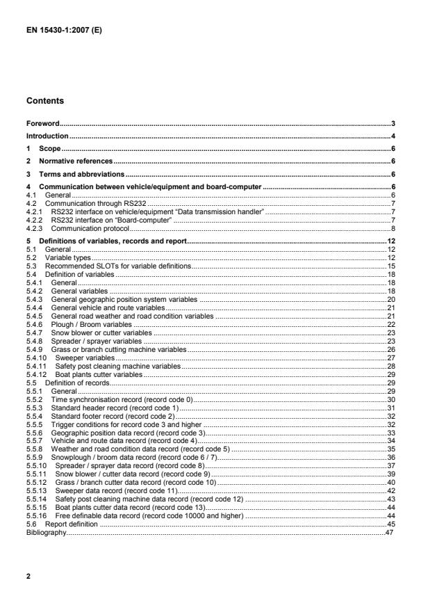 2 ContentsForeword.3 Introduction.4 1 Scope.6 2 Normative references.6 3 Terms and abbreviations.6 4 Communication between vehicle/equipment and board-computer.6 4.1 General.6 4.2 Communication through RS232.7 4.2.1 RS232 interface on vehicle/equipment “Data transmission handler”.7 4.2.2 RS232 interface on “Board-computer”.7 4.2.3 Communication protocol.8 5 Definitions of variables, records and report.12 5.1 General.12 5.2 Variable types.12 5.3 Recommended SLOTs for variable definitions.15 5.4 Definition of variables.18 5.4.1 General.18 5.4.2 General variables.18 5.4.3 General geographic position system variables.20 5.4.4 General vehicle and route variables.21 5.4.5 General road weather and road condition variables.21 5.4.6 Plough / Broom variables.22 5.4.7 Snow blower or cutter variables.23 5.4.8 Spreader / sprayer variables.23 5.4.9 Grass or branch cutting machine variables.26 5.4.10 Sweeper variables.27 5.4.11 Safety post cleaning machine variables.28 5.4.12 Boat plants cutter variables.29 5.5 Definition of records.29 5.5.1 General.29 5.5.2 Time synchronisation record (record code 0).30 5.5.3 Standard header record (record code 1).31 5.5.4 Standard footer record (record code 2).32 5.5.5 Trigger conditions for record code 3 and higher.32 5.5.6 Geographic position data record (record code 3).33 5.5.7 Vehicle and route data record (record code 4).34 5.5.8 Weather and road condition data record (record code 5).35 5.5.9 Snowplough / broom data record (record code 6 / 7).36 5.5.10 Spreader / sprayer data record (record code 8).37 5.5.11 Snow blower / cutter data record (record code 9).39 5.5.12 Grass / branch cutter data record (record code 10).40 5.5.13 Sweeper data record (record code 11).42 5.5.14 Safety post cleaning machine data record (record code 12).43 5.5.15 Boat plants cutter data record (record code 13).44 5.5.16 Free definable data record (record code 10000 and higher).44 5.6 Report definition.45 Bibliography.47