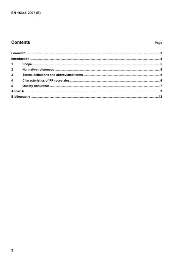 EN 15345:2007 is a standard published by the European Committee for Standardization (CEN). Its full title is "Plastics - Recycled Plastics - Characterisation of Polypropylene (PP) recyclates". This standard covers: This European Standard defines a method of specifying delivery conditions for Polypropylene (PP) recyclates. It gives the most important characteristics and associated test methods for assessing a single batch of PP recyclates intended for use in the production of semi-finished/finished products. It is intended to support parties involved in the use of recycled PP to agree on specifications for specific and general applications. This standard does not cover the characterisation of plastics wastes. See EN 15347. This standard is applicable without prejudice to any existing legislation.