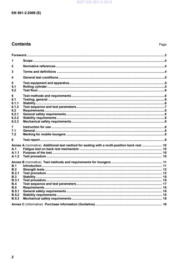 EN 581-2:2009 is a standard published by the European Committee for Standardization (CEN). Its full title is "Outdoor furniture - Seating and tables for camping, domestic and contract use - Part 2: Mechanical safety requirements and test methods for seating". This standard covers: This part of EN 581 specifies the mechanical safety requirements and test methods of outdoor seating for camping, domestic and contract use for adults, without regard to materials, design/construction or manufacturing processes. This document does not apply to outdoor furniture for severe contract use, where higher requirements may be necessary nor to removable upholstery and coverings, permanently fixed furniture and street furniture. The test requirements contained within this European Standard are based on use by persons weighing up to 110 kg. Information regarding ageing and degradation caused by light, temperature and moisture has not been included. Annex A (normative) specifies additional test methods for seating with multi-position back rests. Annex B (normative) specifies test methods for loungers. Annex C (informative) specifies guidelines for purchase information.