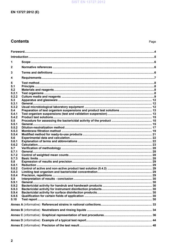 This European Standard applies to products that are used in the medical area in the fields of hygienic handrub, hygienic handwash, surgical handrub, surgical handwash, instrument disinfection by immersion, and surface disinfection by wiping, spraying, flooding or other means. This European Standard applies to areas and situations where disinfection or antisepsis is medically indicated. Such indications occur in patient care, for example: in hospitals, in community medical facilities and in dental institutions; in clinics of schools, of kindergartens and of nursing homes; and may occur in the workplace and in the home. It may also include services such as laundries and kitchens supplying products directly for the patients. NOTE 1 The method described is intended to determine the activity of commercial formulations or active substances under the conditions in which they are used. NOTE 2 This method corresponds to a phase 2 step 1 test. NOTE 3 This method cannot be used to evaluate the activity of products against Legionella in watersystems against mycobacteria and against bacterial spores. EN 14885 specifies in detail the relationship of the various tests to one another and to “use recommendations”. 2 Normative references The following documents, in whole or in part, are normatively referenced in this document and are indispensable for its application. For dated references, only the edition cited applies. For undated references, the latest edition of the referenced document (including any amendments) applies. EN 12353, Chemical disinfectants and antiseptics — Preservation of test organisms used for the determination of bactericidal (including Legionella), mycobactericidal, sporicidal, fungicidal and virucidal (including bacteriophages) activity EN 14885, Chemical disinfectants and antiseptics — Application of European Standards for chemical disinfectants and antiseptics 3 Terms and definitions For the purposes of this document, the terms and definitions given in EN 14885 apply. SIST EN 13727:2012